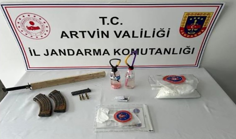 Edinilen bilgiye göre, Artvin Jandarma KOM Şube Müdürlüğünden narkotik operasyonu kapsamında, Sakalar köyü yol ayrımında yapılan uygulamada güveni kötüye kullanma, kullanmak için uyuşturucu veya uyarıcı madde satın almak kabul etmek veya bulundurmak, 6136 Sayılı Kanuna Muhalefet suçlarından toplam 3 adet suç kaydı mevcut bulunan şahısın aracında yapılan aramada, araç içinde farklı bölmelere saklanmış zulalarda 1.675 g metamfetamin, 3 adet uyuşturucu kullanma aparatı, 2 adet Kaleşnikof marka uzun namlulu silaha ait şarjör, 1 adet tabanca şarjörü, 9 adet farklı ebatlarda fişek, 1 adet 70 cm uzunluğunda kılıç ele geçirildi.