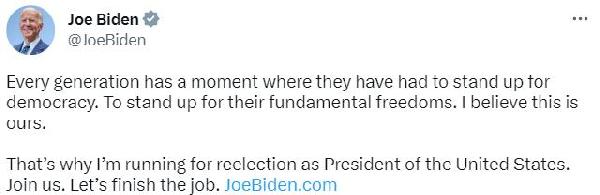 ABD Başkanı Biden, “Her neslin demokrasi için ayağa kalkmak zorunda kaldığı bir an vardır. Temel özgürlükleri için ayağa kalkmak. Ben bunun bizimki olduğuna inanıyorum. İşte bu yüzden Amerika Birleşik Devletleri Başkanı olarak yeniden seçilmek için adaylığımı koyuyorum. Bize katılın. Bu işi bitirelim” dedi.