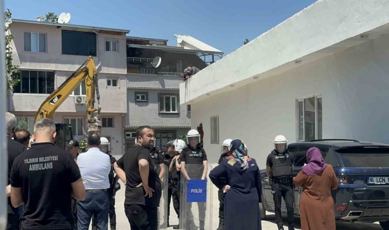 Bursa ’da Yıldırım Belediyesi’nin kaçak ve depreme dayanıksız binalarla mücadelesi aralıksız sürüyor. Millet Mahallesi’nde kaçak olduğu için daha önce 4 kez yıkılan bina 5.kez yıkılmak istenince sahipleri çatıya çıkarak direndi.