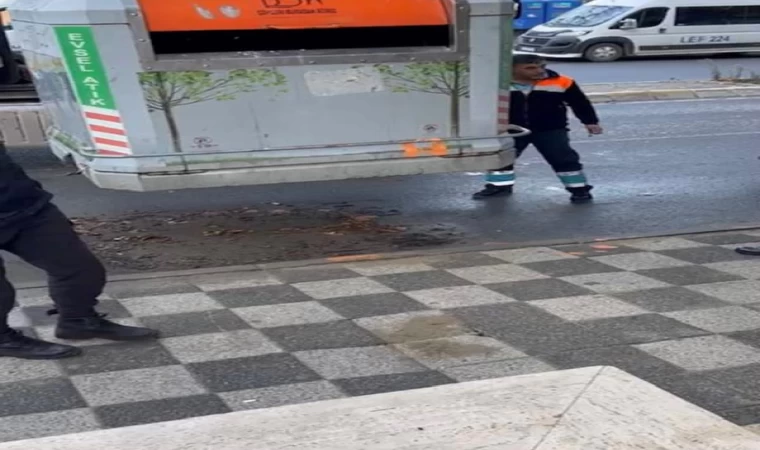 Belediye ekipleri, çöp dolu konteyneri vinçle kaldırdı. Konteynerin alt kapaklarının yavaşça açılmasıyla çöplerle birlikte içindeki kişi yere düştü. Çöpten çıkan kişi ambulansla hastaneye götürüldü. O anlar cep telefonu kamerasına kaydedildi.