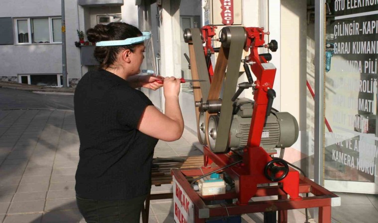 Bilecik’in Bozüyük ilçesinde bıçak bileme işi yapan Meltem Çelik’i görenler şaşkınlık yaşarken Çelik işini en iyi şekilde yapıyor. Yaklaşık 7 yıl önce çilingir ve anahtar çoğaltma dükkanı açtıklarını ve müşterilerinin talepleri doğrultusunda bıçak bileme işine başladığını anlatan Meltem Çelik, “Müşterilerimizden gelen istek üzerine bıçak bileme makinesini temin ettik. Özellikle Kurban Bayramı öncesi çok yoğun çalışmaktayız. Gece geç saatlere kadar buradayız. Müşterilerimize hizmet etmekteyiz. Bıçak bileme makinemizde sonsuz zımpara var. Müşterilerimizden gelen kör bıçakları, önce ağzını düzeltiyoruz, sonra bileme makinesinde biliyoruz. En son bıçaklarımız da kalan çapakları kılağ makinesinde alıyoruz ve bıçaklarımızı keskin hale getiriyoruz” dedi.
