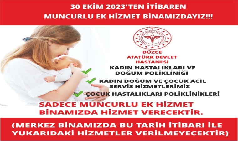 DÜZCE(İHA) – Düzce’de kadın doğum, kadın hastalıkları, çocuk acil servis ve çocuk hastalıkları poliklinikleri 30 Ekim 2023 gününden itibaren Atatürk Devlet Hastanesi Muncurlu ek hizmet binasında verilecek.