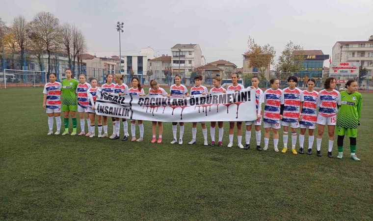 Düzce(İHA) – İlk maçına çıkan Düzce Kadın Futbol Takımı oyuncuları İsrail’in yaptığı katliama, kadın cinayetlerine ve çocuk ölümlerine dikkat çekmek için sahaya farklı eylemle çıktılar. Hayali çocukların ellerinden tutup sahaya çıkan kadın futbolcular, seremoni sırasında da pankart açıp İsrail ve insanlığa çağrı yaptı.