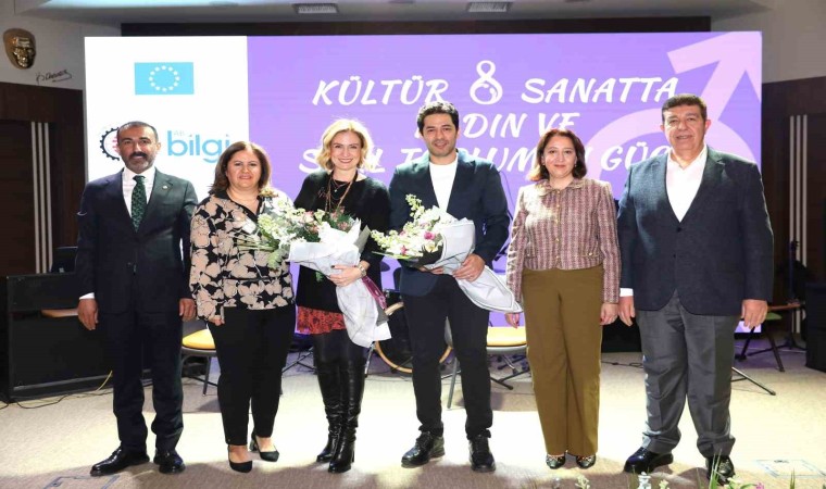 Kültür ve sanatta toplumsal cinsiyet eşitliği üzerine gerçekleşen söyleşide Oyuncu Ceyda Düvenci ise manevi ve fiziksel şiddete dikkat çekerek, “Hayatınızda hiç kimsenin size manevi ya da bedensel şiddet uygulamasına izin vermeyin. Hiç kimse size kelimeleriyle de bedeniyle de zarar veremez. Önce cümlelerimizi, sonra sinirimizi kustuğumuz kelimelerimizi, sonra da gerçek sevginin içinde herhangi bir şiddet olmadığını önce kendimize sonra evlatlarımıza hatırlatırsak bir sene sonra bile farklı şeyler konuşuyor olacağız” diye konuştu.