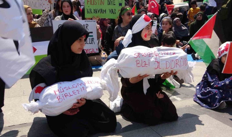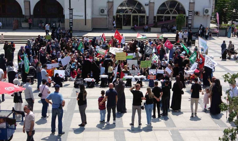 Ulu Cami önünde bir araya gelen kadınlar, ellerinde Filistin ve Türk bayraklarının yanı sıra çeşitli pankartlar taşıdı. Sloganlar atarak, İsrail’in Gazze’ye yönelik saldırılarını protesto eden kadınlar, zaman zaman tekbir getirdi. Bir kız çocuğu da ilahi okudu.