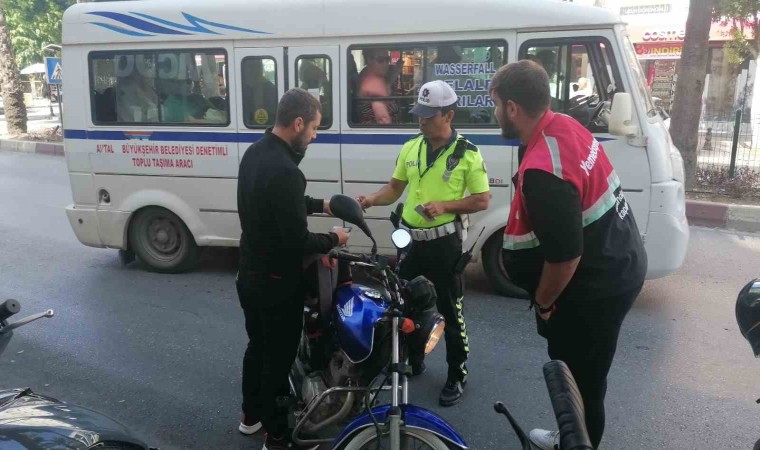 Antalya’nın Manavgat ilçesinde polisin yaptığı motosiklet denetiminde neredeyse kasksız motosiklet çıkmadı. Kaskı başlarına takmak yerine motosiklete takan sürücülerin tamamına ceza kesilirken, yaşı küçük olan sürücülerin motosikleti bağlandı. Kask takmayan motosikletli kurye, denetim yapan trafik polislerini görünce panikleyerek yanındaki motosiklete çarparken, şans eseri yaralanan olmadı. Trafik polisinin durdurduğu yaşı küçük, ehliyetsiz çocuğun ‘babasına da ceza gideceğini öğrenince’ polislere ceza yazmamaları için döktüğü dil çare olmadı.