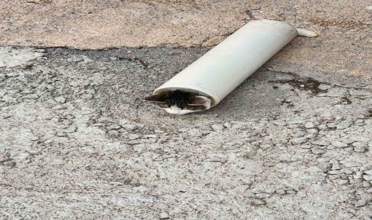 Ankara’nın Akyurt ilçesinde kafası plastik boruya sıkışan yavru kedi, Akyurt Belediyesi personeli ve itfaiye ekipleri tarafından kurtarıldı.