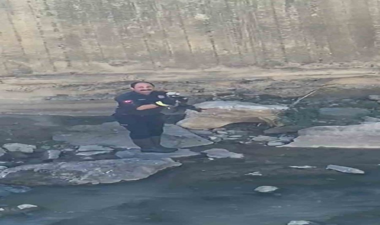 Ayaklarına çizmeyi geçiren itfaiye görevlisi Harşit Çayını aşarak derenin karşı tarafındaki kediye ulaşarak dere yatağından kurtardı.