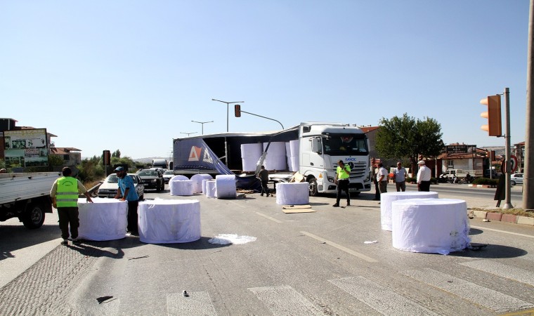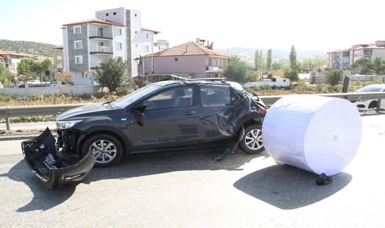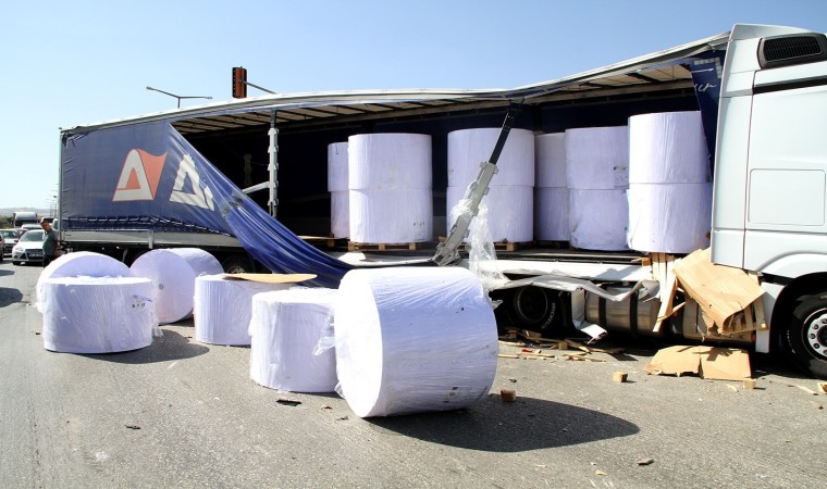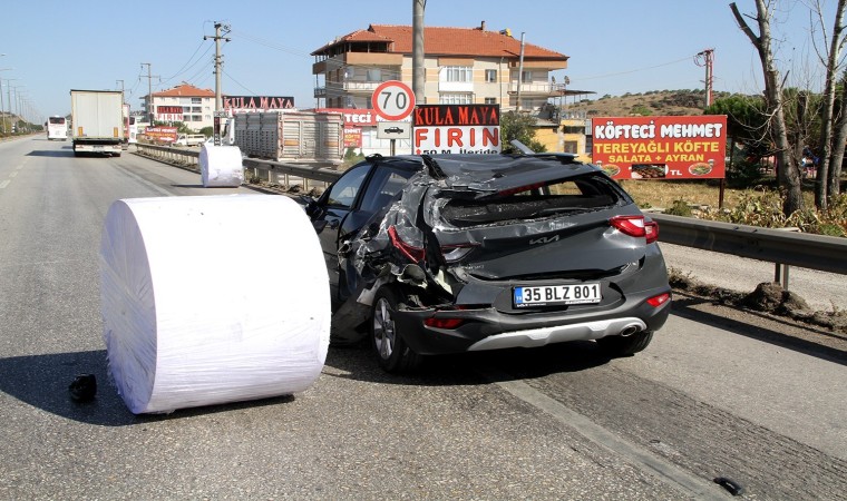 Manisa’nın Kula ilçesinde seyir halindeki kağıt bobinleri yüklü tırın aynı yönde giden bir otomobile çarpmamak için manevra yapmasıyla, tırda yüklü kağıt bobinleri yola savruldu. Ani manevranın etkisiyle yola savrulan bobinlerden biri, bir otomobilin üzerine düştü. Şans eseri araç sürücüsü kazayı yara almadan atlatırken, facianın eşiğinden dönülen kazada otomobil kullanılamaz hale geldi.