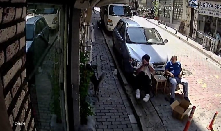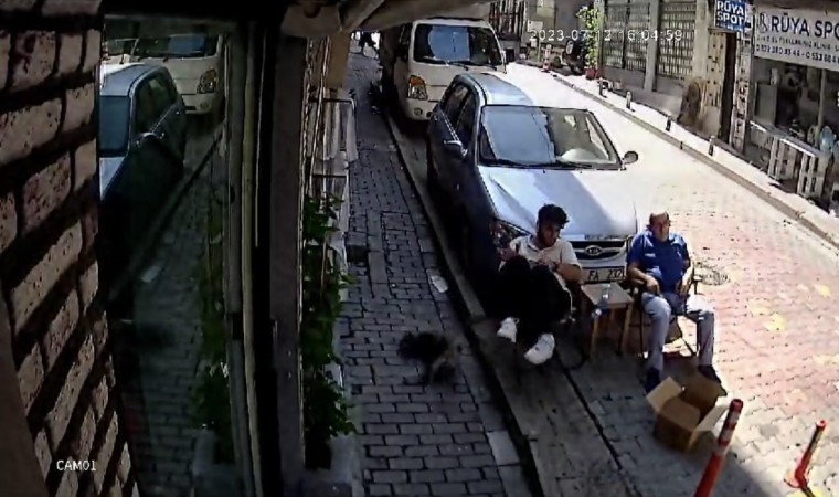 Kağıthane’de kaldırımda oturan bir kişinin üzerine ikinci kattan kedi düştü. Kedinin adamın üzerine düştüğü anlar kameraya yansıdı.