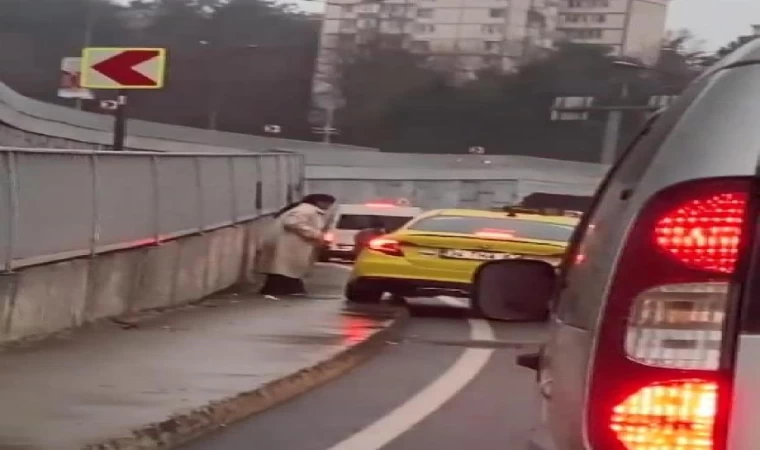 Fatih Sultan Mehmet Köprüsü bağlantı yolunda, trafik yoğunluğu nedeniyle 34 THA 82 plakalı taksi şoförü, aracın bir lastiğini kaldırıma çıkararak ilerlemek istedi. O sırada kaldırımdan yürüyen bir kadın, taksiye vurarak tepki gösterdi. O anlar, başka bir otomobildeki yolcu tarafından cep telefonuyla görüntülendi.(DHA)