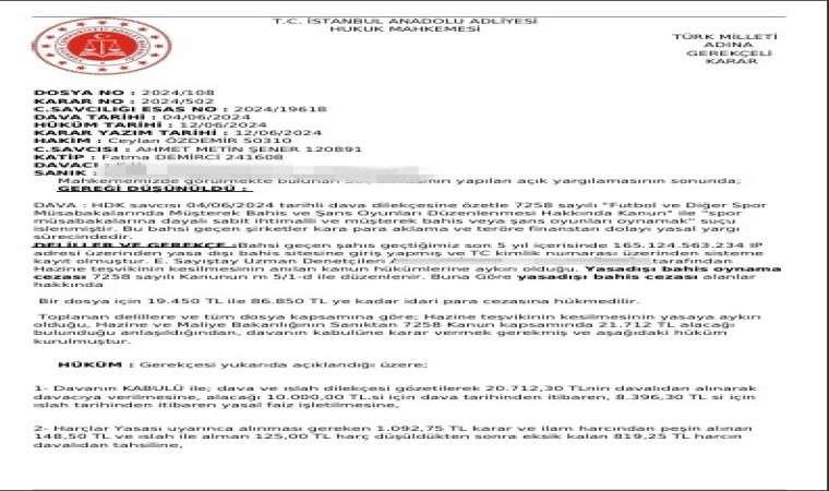Hakkındaki dosyanın gerçeğinden farkı olmadığını belirten Cemil K., “Bir hukuk bürosu var, bir santral sistemi var ve çok disiplinli konuşan, hukuki terimler kullanan birileri var. İlgili kişi bir dosyam olduğunu bir bahis sitesinde geçmiş yıllarda bahis oynadığımı ve bununla ilgili adli kararın çıktığını ifade etti. Ben de nasıl bir bahis oynadığımı sordum. Kendileri oynadığımı iddia etmeye çalıştılar, ‘Bununla ilgili yargı kararını bana atar mısınız’ dedim. ’Size atacağız’ dediler, hemen evrak attılar WhatsApp ortamından. Gelen evraka baktım, gerçekten hakkımda bir karar verilmiş, bir belge oluşturulmuş. İlk başta yukarıdaki kısımlara baktığınız zaman gerçekten bir kurumsal belge gibi görünüyordu” ifadelerini kullandı.