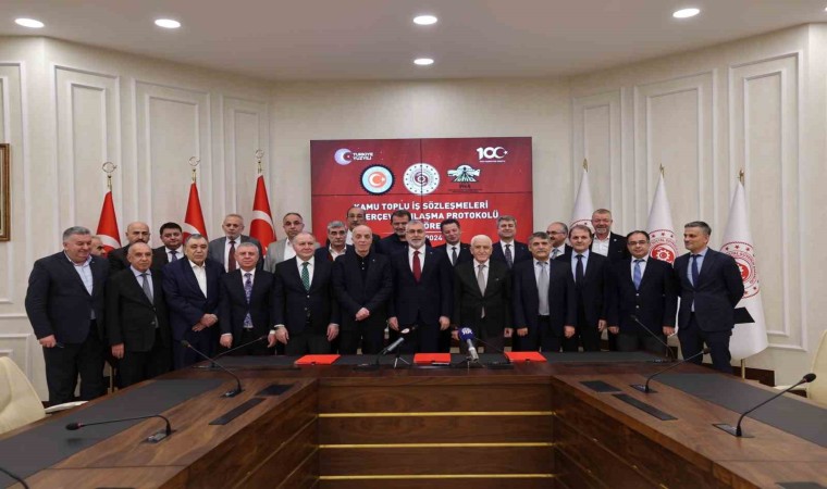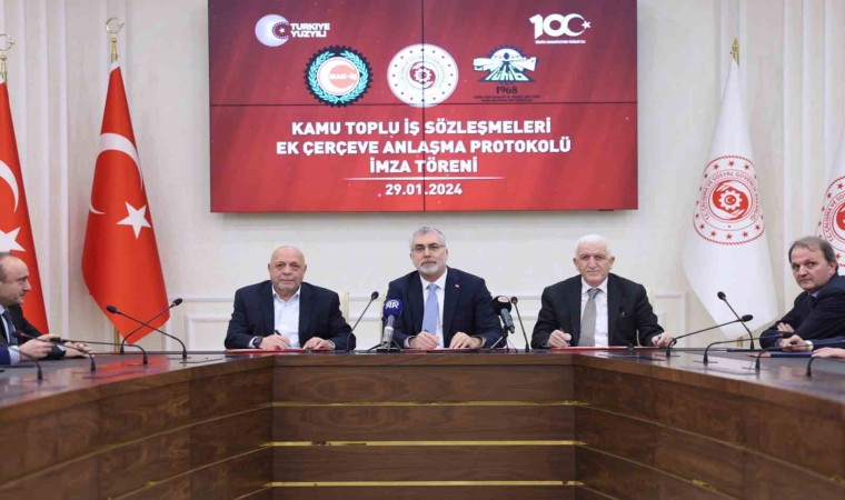 Çalışma ve Sosyal Güvenlik Bakanlığı ev sahipliğinde Türkiye İşçi Sendikaları Konfederasyonu (TÜRK-İŞ) ve Hak İşçi Sendikaları Konfederasyonu (HAK-İŞ) ile Kamu Toplu İş Sözleşmeleri Ek Çerçeve Anlaşması Protokolü imzalandı. Kamu işçilerinde enflasyon ve ücret zammının toplamından oluşan oranın yüzde 32,57 olarak uygulanmasını içeren ek protokol imza törenine Çalışma ve Sosyal Güvenlik Bakanı Vedat Işıkhan ve TÜHİS Genel Sekreteri Adnan Çiçek katıldı. Bakan Işıkhan, törende yaptığı konuşmada 2023-2024 dönemini kapsayan Toplu İş Sözleşmesi Çerçeve Anlaşma Protokolü’nün 9 Mayıs 2023’te imzalandığını hatırlatarak, “Bu kapsamda işçilerimizin aylık brüt çıplak ücretlerini 15 bin liraya yükseltmiştik. Ayrıca bu 15 bin lira ücretin üzerine 2023 yılı ilk altı ayı için refah payı dahil olmak üzere yüzde 45 oranında zam yapılmış ve diğer kalemlerde de iyileştirmeler gerçekleştirilmişti. Bu dönemde işçi konfederasyonlarımız ve sendikalarımızın tam bir mutabakatıyla toplu iş sözleşmesini imza altına almıştık” ifadelerini kullandı.