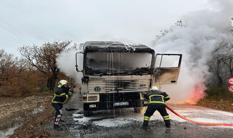 Kırklareli’nin Vize ilçesine seyir halindeyken henüz belirlenemeyen sebeple alev alan kamyon, cayır cayır yandı.