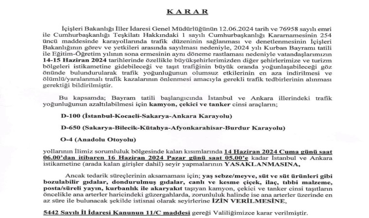 Sakarya Valiliği, Kurban Bayramı başlangıcında trafik yoğunluğunun azaltılması ve muhtemel kazaların engellenmesi için kamyon, çekici ve tanker cinsi araçlara seyir yasağı getirdi.