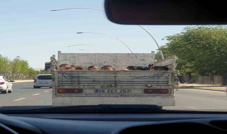 Ankara’da açık kasa kamyonetin arkasında tehlikeli yolculuk yapan çok sayıda kişi kameraya yansıdı.