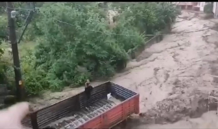 Kamyon sürücüsü sel sularında dehşeti yaşadı, o anlar kamerada