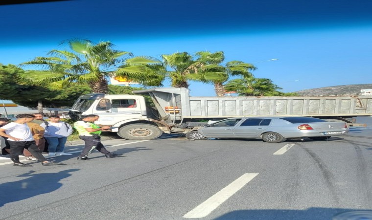 Aydın’ın Kuşadası ilçesinde, önünde seyir halinde ilerleyen otomobilin ani fren yapması sonucu şerit değiştiren kamyona arkadan gelen otomobil çarptı. Kaza yapan otomobilden sürücüsü burnu bile kanamadan çıktı.
