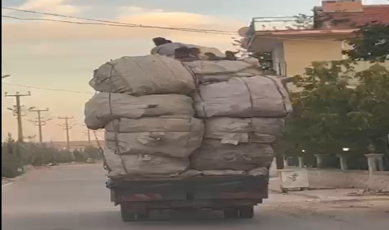 İlçe merkezi çıkışında seyreden kamyonetin kasasındaki yükün üzerinde bulunan 4 çocuk dikkat çekti. Kasadaki içerisinde hurda malzeme olduğu tahmin edilen çuvalların üzerinde yolculuk yapan çocuklar, gören vatandaşların yüreğini ağzına getirdi. Çocuklardan ikisi ise, çuvalların üzerindeki yolculuk sırasında yol üzerindeki elektrik tellerine çarpmamak için eğilirken, araç dakikalarca trafikte seyretti. Durumu fark eden başka bir araçtakiler ise o anları cep telefonu kamerasıyla görüntülerken, "Çok tehlikeli hareketler, yaklaşma. Telden nasıl geçti, ölecek" şeklindeki konuşmalar dikkat çekti. Uzun bir süre bu şekilde yolculuğa devam eden araç daha sonra gözden kayboldu.