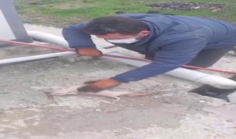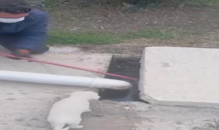 Hatay’ın Kumlu ilçesinde bir vatandaşın kanalizasyon kuyusuna düşen 3 yavru köpeği elindeki sopayla kurtardığı anlar kameraya yansıdı.