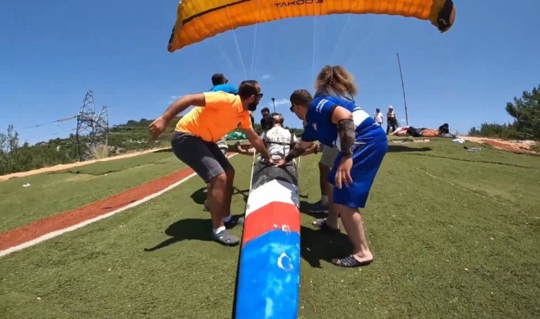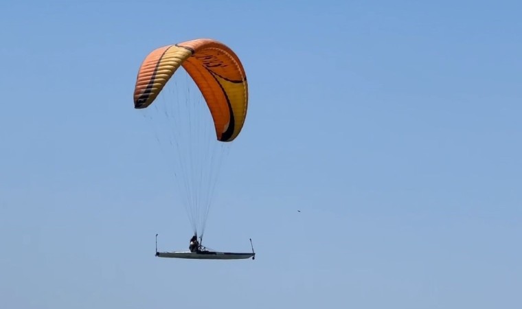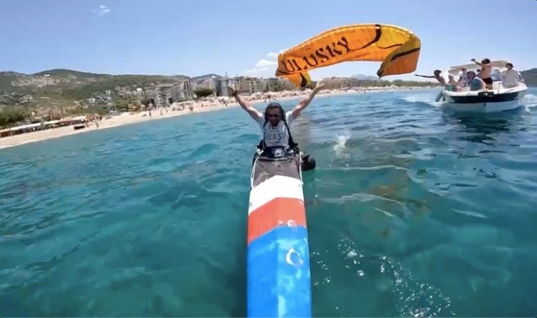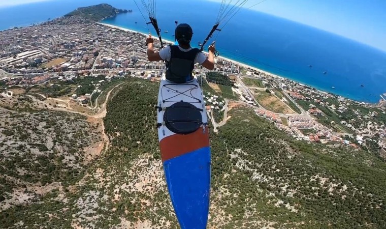 Antalya’nın Alanya ilçesinde yamaç paraşütü pilotu Hasan Kaval, özel olarak hazırladığı düzenek sayesinde paraşütüne bağladığı kano ile denize iniş yaptı.