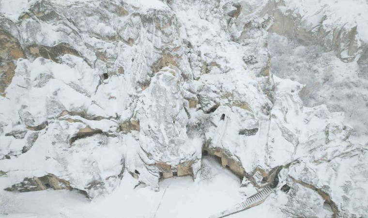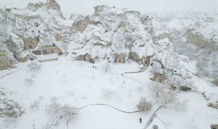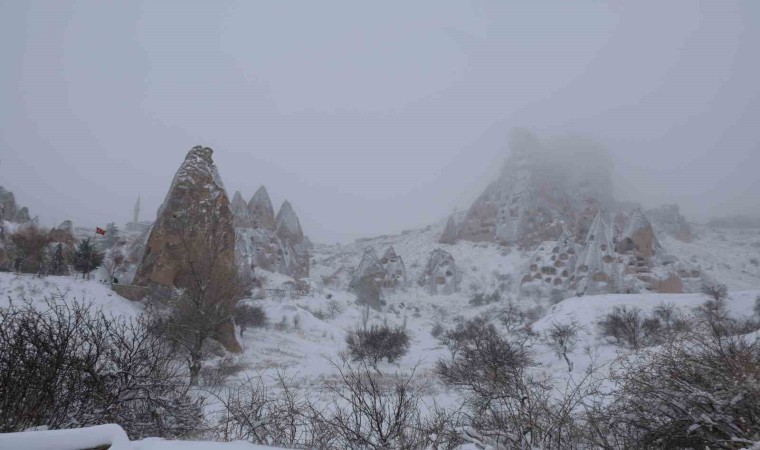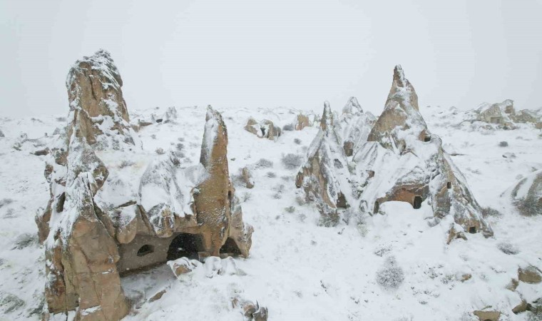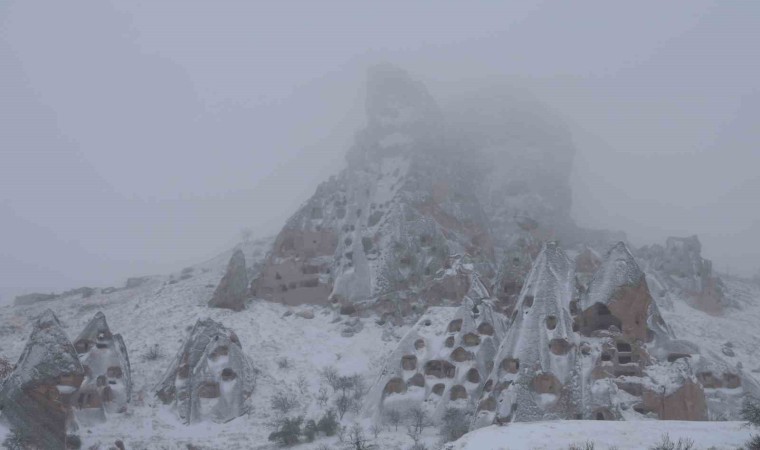 NEVŞEHİR (İHA) – UNESCO Dünya Doğal ve Kültürel miras listesinde yer alan Kapadokya bölgesinde etkili olan kar yağışı kartpostallık görüntüler oluşturdu.