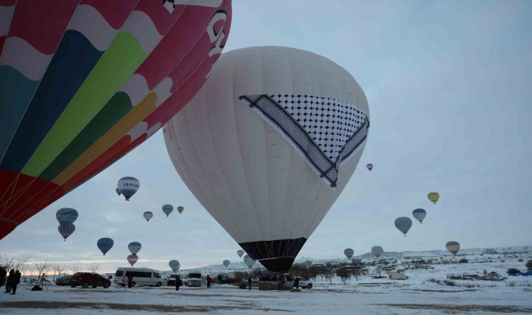 Gazze’de yaşanan soykırım Kapadokya’da uçurulan kefiye desenli sıcak hava balonları ile protesto edildi.