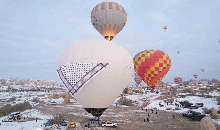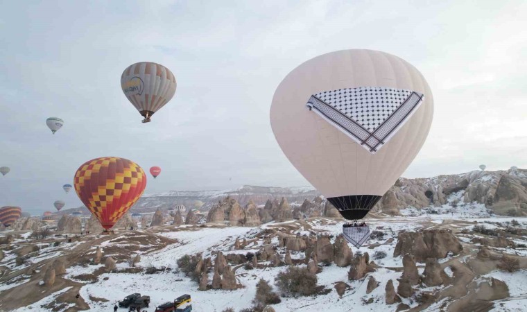 Gazze’de yaşanan soykırım, Kapadokya’da uçurulan kefiye desenli sıcak hava balonları ile protesto edildi. Kültür Medeniyet Vakfı (KÜME) Başkanı Abdullah Eren, “KÜME Vakfı olarak bugün Kapadokya’da sıcak hava balonlarına kefiyeler takarak, Gazze halkının yanında olduğumuzu bir kez daha göstermek istiyoruz” dedi.
