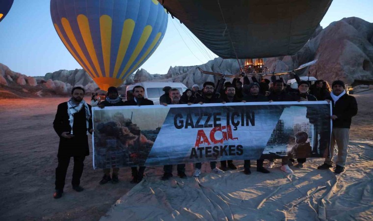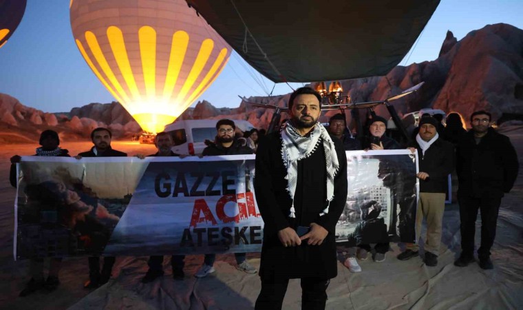 Kapadokya’da sıcak hava balonları ’Gazze’de ateşkes’, ’Savaşa Hayır’ pankartları ile havalandı.