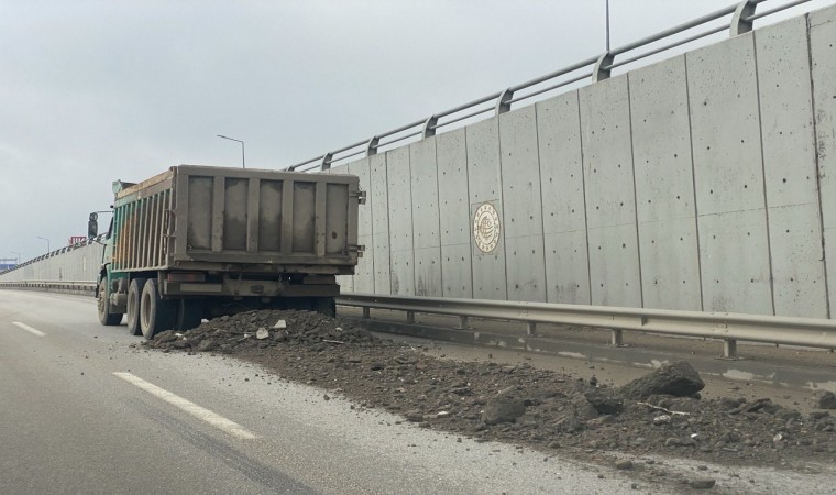 Adıyaman’da seyir halinde olan bir kamyonun damper kapağının açılması sonucu karayoluna moloz döküldü.