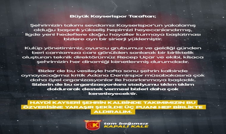Kayserispor Süper Lig’in 13. haftasında, Pazar günü sahasında ve taraftarı önünde Adana Demirspor’u konuk edecek. Taraftar grubu Kapalı Kale’den yapılan açıklamada ise, "Şehrimizin takımı sevdamız Kayserispor’un yakalamış olduğu başarılı yükseliş hepimizi heyecanlandırmış, ligde yeni hedeflere doğru hayaller kurmaya başlatması bizlere ayrı bir sinerji yüklemiştir. Kulüp yönetimimiz, oyuncu grubumuz ve geldiği günden beri camiamıza canı gönülden sarılarak bir birliktelik oluşturan Teknik Direktörümüz Recep Uçar ve ekibi kısaca şehrimizin her dinamiği kenetlenmiş durumdadır. Bizler de bu vesileyle hafta sonu şehrin kalbinde oynayacağımız kritik Adana Demirspor müsabakasına çok daha özel organizasyonlar ile hazırlanmaya başladık. Sizlerin de bu organizasyonlara stadyumu tıklım tıklım doldurarak destek vermesi bizleri daha çok kenetleyecektir. Haydi Kayseri şehrin kalbinde takımımızın bu özverisine yakışır şekilde 3 puanı hep birlikte aldıralım” denildi.