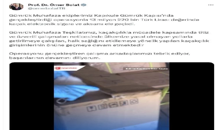 Bakan Bolat, sosyal medya hesabından yaptığı açıklamada, "Gümrük Muhafaza ekiplerimiz Kapıkule Gümrük Kapısı'nda gerçekleştirdiği operasyonla 13 milyon 220 bin Türk Lirası değerinde kaçak elektronik sigara ve aksamı ele geçirdi. Gümrük Muhafaza Teşkilatımız, kaçakçılıkla mücadele kapsamında titiz ve özverili çalışmaları neticesinde ülkemize yasal olmayan yollarla getirilmeye çalışılan, halk sağlığını etkilemeye yönelik yapılan kaçakçılık girişimlerinin önüne geçmeye devam etmektedir. Operasyonu gerçekleştiren çalışma arkadaşlarımızı tebrik ediyor, başarılarının devamını diliyorum" dedi. (DHA)