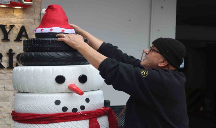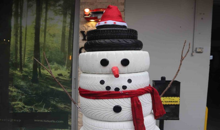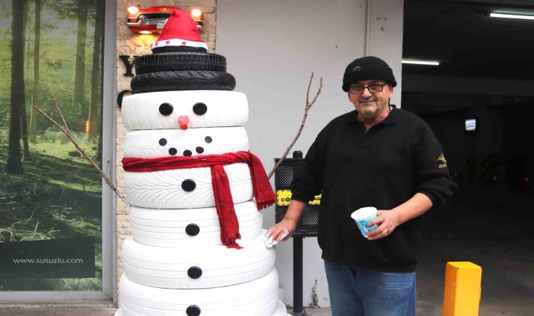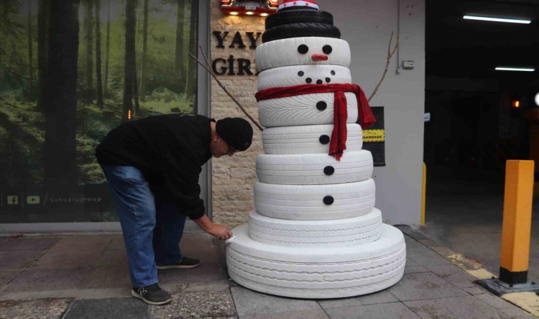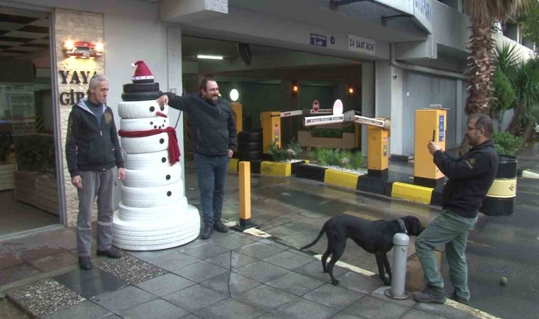 İzmir’de otopark çalışanları yıllardır çektiği kar hasretini gidermek için çözümü ‘lastik adamda’ buldu. Geri dönüşüm malzemelerinden yaptıkları ‘lastik adam’ bölge esnafının maskotu oldu.