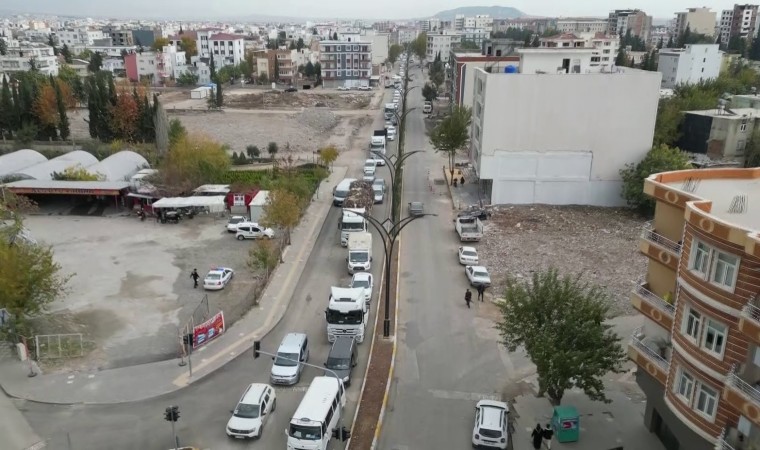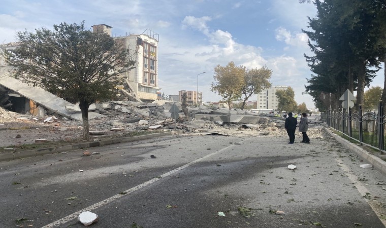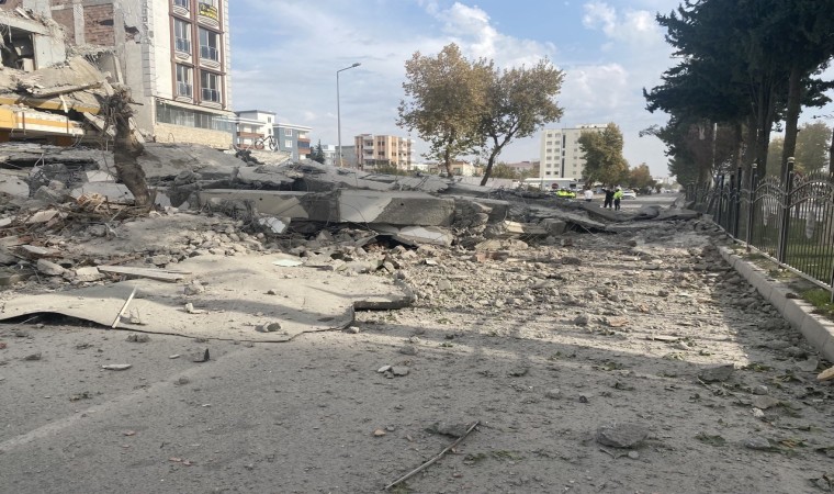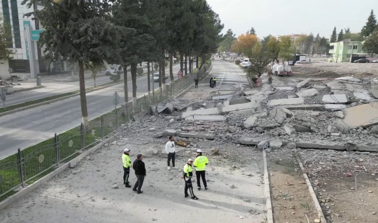 Adıyaman’da yıkımına başlanılan ağır hasarlı binanın kara yoluna yıkılması kentte trafik yoğunluğuna neden oldu.