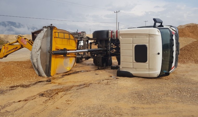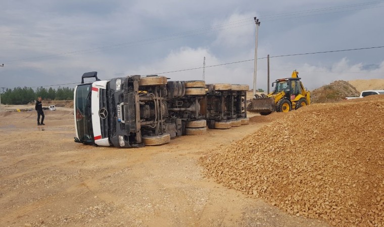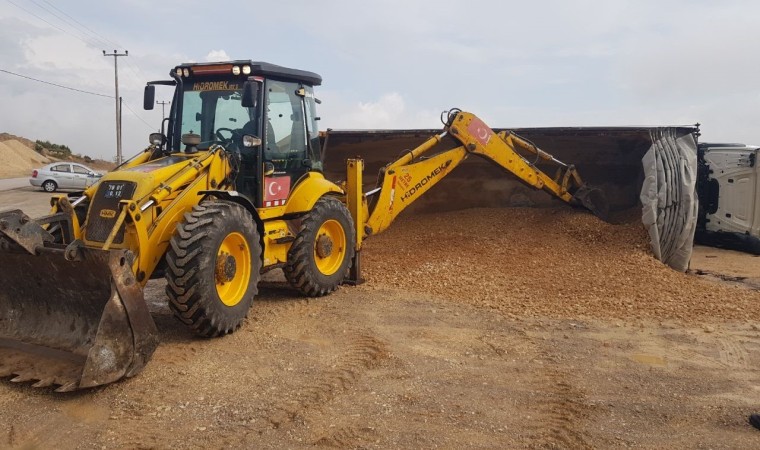 Devrilen kamyon kepçe yardımıyla boşaltılırken, vinç yardımıyla olay yerinden kaldırıldı.