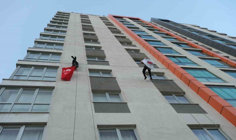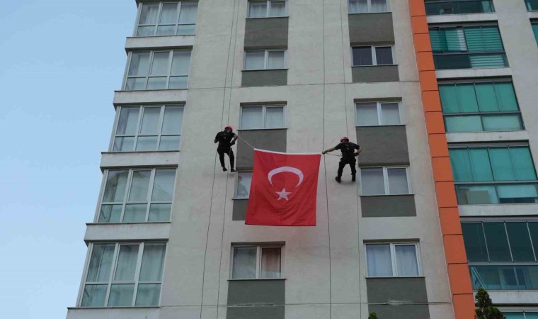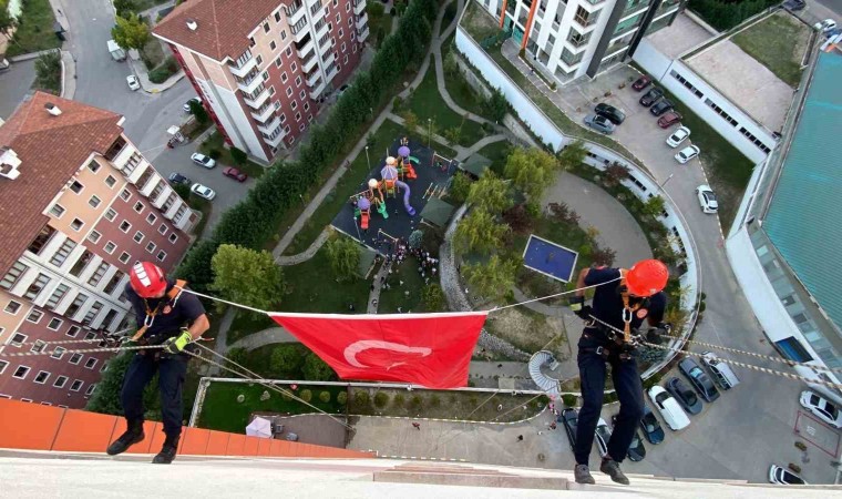 Karabük’te İtfaiye Haftası etkinlikleri kapsamında itfaiye ekipleri 16 katlı binadan tatbikat gerçekleştirdi.