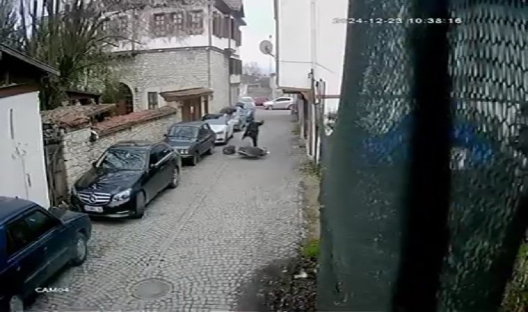 Safranbolu ilçesi Kirişçi Sokak’taki ilk kazada, karşı yönden gelen otomobille çarpışmamak için sürücüsünün manevra yaptığı motosiklet devrildi. Sürüklenen motosikletten düşen sürücü İ.E.G., savrularak park halindeki otomobile çarptı. Otomobil sürücüsü yoluna devam ederken, İ.E.G. ise kazayı ufak sıyrıkla atlattı. İ.E.G., ters yönden geldiğini öne sürdüğü otomobilin sürücüsünden şikayetçi oldu. Kaza anı bir tarihi konağın güvenlik kamerası tarafından kaydedildi.