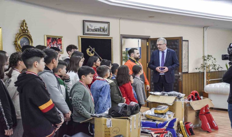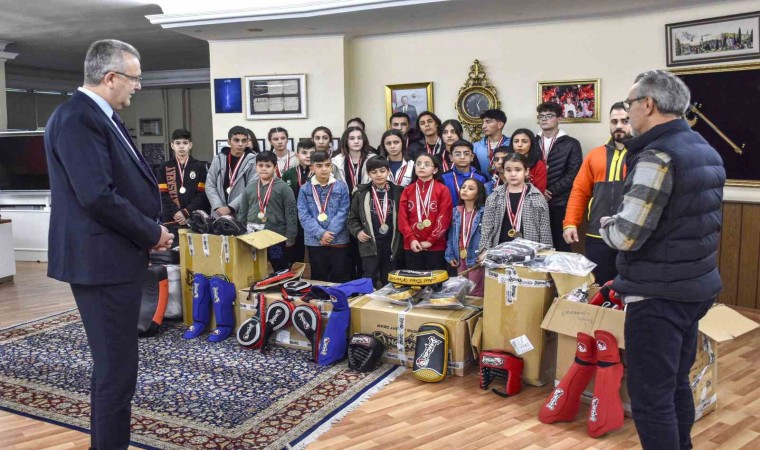 Karacabey Gençlik Spor Kulübü sporcuları Bursa Wushu Şampiyonası’na damga vurarak, dikkatleri üzerlerine çekti. Karacabey Belediyespor çatısı altında şampiyonada yer alan sporcular, toplamda 13 altın, 9 gümüş ve 2 bronz madalya kazandı. Karacabey Gençlik Spor Kulübü sporcuları, Antrenörleri Yılmaz Şahin ve Ömer Gönültaş ile birlikte Bursa Wushu Şampiyonası sonrasında Belediye Başkanı Ali Özkan’ı ziyaret etti. Spora verDİĞİ desteklerden dolayı Başkan Özkan’a teşekkür eden Antrenör Yılmaz Şahin, “Karacabey Gençlik Spor Kulübü olarak, 4-5 ve 18-19 Kasım tarihlerinde düzenlenen Bursa Wushu Şampiyonası’na 25 sporcumuzla katıldık. Bu şampiyonadan 13 tane birincimiz altın madalya, 9 tane ikincimiz gümüş madalya ve 2 tane üçüncümüz ise bronz madalya kazanarak bizleri onurlandırdı. Aynı zamanda kulübümüz, kulüpler bazında Bölge Üçüncülüğü elde etti. Antrenmanlarda zaman zaman malzeme eksikliğimiz oluyordu. Çocuklarımızla birlikte ne kadar zengin malzemeyle antrenman yapma şansı bulursak, yarışmalarda o kadar başarılı oluyor. Yeni malzemelerle birlikte daha verimli antrenmanlar yaparak, çok daha büyük başarılarla Karacabey’i gururlandıracağız” şeklinde konuştu.