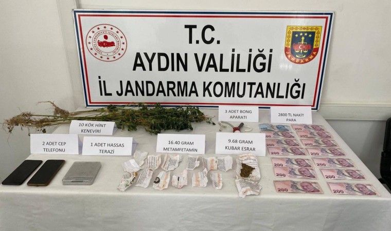 Karacasu İlçe Jandarma Komutanlığınca uyuşturucu madde imal ve ticareti yapan S.A (51) ve M.K.(22) isimli şahıslara yönelik çalışma başlatıldı. Karacaören Mahallesinde (S.A) isimli şüpheli şüpheli şahsın aracında, ikametinde ve zeytinlik arazisinde yapılan aramada, muhtelif miktarda uyuşturucu madde ( Metamfetamin, kubar esrar), 3 adet uyuşturucu kullanma aparatı, 10 kök hint keneviri, 1 adet hassas terazi, suçtan elde edildiği değerlendirilen bir miktar nakit para ele geçirildi. İşlemlerinin ardından adli makamlara sevk edilen (S.A) tutuklanırken, (M.K) ise adli kontrol kararı ile serbest bırakıldı.