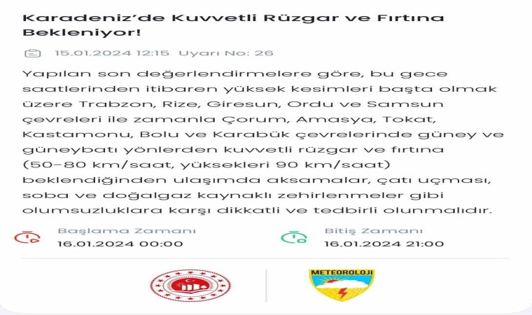 Meteorolojiden yapılan uyarıda yapılan son değerlendirmelere göre, 15 Ocak gece saatlerinden itibaren yüksek kesimleri başta olmak üzere Trabzon, Rize, Giresun, Ordu ve Samsun çevreleri ile zamanla Çorum, Amasya, Tokat, Kastamonu, Bolu ve Karabük çevrelerinde Güney ve Güneybatı yönlerden kuvvetli rüzgar ve fırtına (saatte 50-80 kilometre, yüksek kesimlerde saatte 90 kilometre) beklendiği belirtildi. Uyarıda, ulaşımda aksamalar, çatı uçması, soba ve doğalgaz kaynaklı zehirlenmeler gibi olumsuzluklara karşı dikkatli ve tedbirli olunması gerektiği belirtildi.