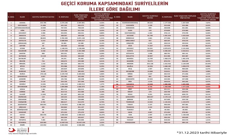 Göç İdaresi Başkanlığı 2023 yılının son günündeki veriler ışığında 81 ilde bulunan yabancıların sayısını açıkladı. Verilere göre Türkiye genelinde geçici koruma kapsamında bulunan Suriyelilerin en çok bulunduğu ilk 10 il sırasıyla İstanbul (529 bin 403), Gaziantep (426 bin 51), Şanlıurfa (300 bin 57), Hatay (282 bin 976), Adana (233 bin 785), Mersin (223 bin 158), Bursa (170 bin 136), İzmir (123 bin 952), Konya (119 bin 664) ve (Kahramanmaraş (89 bin 633) olarak açıklandı. Açıklanan verilere göre Samsun da 8 bin 740 geçici koruma kapsamında bulunan Suriyeli ile Karadeniz Bölgesi’nde yer alan 18 il arasından en çok Suriyeliye ev sahipliği yapan il konumunda oldu.