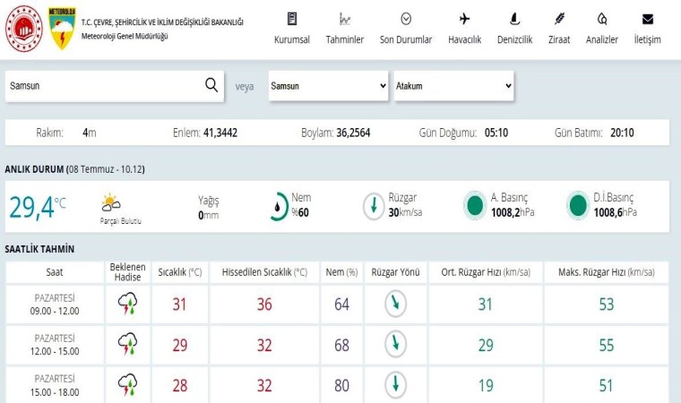 Meteorolojiden yapılan uyarılarda ise “Yapılan son değerlendirmelere göre bölge genelinde havanın parçalı ve az bulutlu, Samsun, Ordu ve Tokat çevreleri ile Amasya’nın doğusunun çok bulutlu ve aralıklı sağanak ve gök gürültülü sağanak yağışlı geçmesi beklenmektedir. Yağışların Samsun’un doğusu ve Ordu çevrelerinde kuvvetli, yer yer çok kuvvetli olması tahmin edilmektedir. Yapılan son değerlendirmelere göre sabah saatlerinden itibaren Samsun’un doğusunda yerel olarak kuvvetli, Ordu çevrelerinde çok kuvvetli (51-75 kg/m2) sağanak ve gök gürültülü sağanak yağış beklendiğinden sel, su baskını, yıldırım, heyelan, yağış anında kuvvetli rüzgar, yerel küçük çaplı dolu yağışı gibi olumsuzluklara karşı dikkatli ve tedbirli olunmalıdır” denildi.