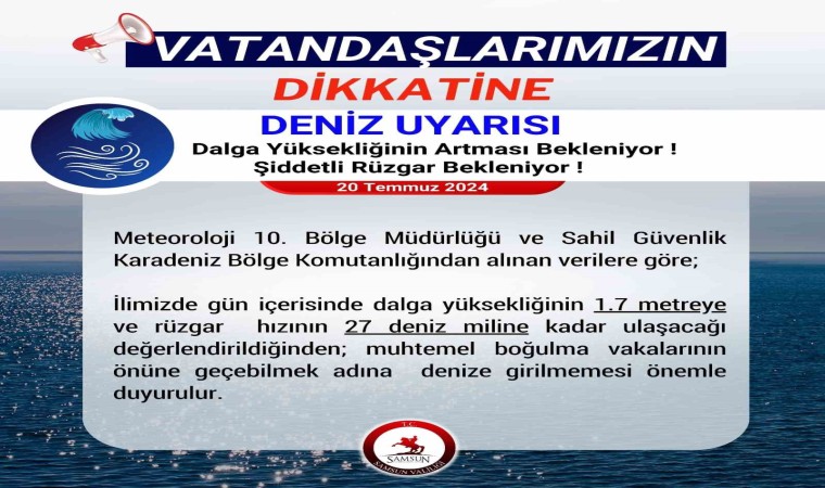 Samsun Valiliği ise şiddetli rüzgar ve dalga uyarısında bulunarak, “Meteoroloji 10. Bölge Müdürlüğü ve Sahil Güvenlik Karadeniz Bölge Komutanlığından alınan verilere göre ilimizde gün içerisinde dalga yüksekliğinin 1,7 metreye ve rüzgar hızının 27 deniz miline kadar ulaşacağı değerlendirildiğinden; muhtemel boğulma vakalarının önüne geçebilmek adına denize girilmemesi önemle duyurulur” ifadelerine yer verdi.