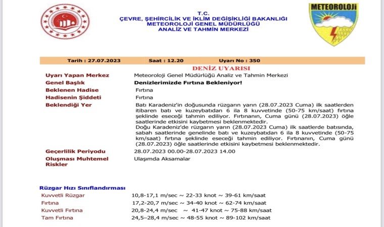 Denizlerde fırtına bekleniyor başlığı ile uyarıda bulunan Meteoroloji 10. Bölge Müdürlüğü açıklamasında, “Batı Karadeniz’in doğusunda rüzgarın 28 Temmuz’da ilk saatlerden itibaren batı ve kuzeybatıdan 6-8 kuvvetinde (50-75 km/saat) fırtına şeklinde eseceği tahmin ediliyor. Fırtınanın Cuma günü öğle saatlerinde etkisini kaybetmesi bekleniyor” ifadelerini kullanıldı. Olması muhtemel riskler olarak ise ulaşımda aksama uyarısında bulunuldu.