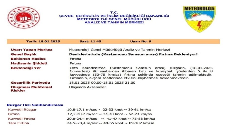 MGM, Analiz ve Tahmin Merkezi, Kastamonu-Samsun arasında Orta Karadeniz’de fırtına uyarısı yaptı. Fırtına hakkında yapılan açıklamada, “Orta Karadeniz’de (Kastamonu-Samsun arası) rüzgarın günün ilk saatlerinden itibaren batı ve kuzeybatı yönlerinden 6-8 kuvvetinde (50-75 km/sa) fırtına şeklinde eseceği tahmin edilmektedir. Fırtınanın, akşam saatlerinde etkisini kaybetmesi beklenmektedir” ifadeleri yer aldı.