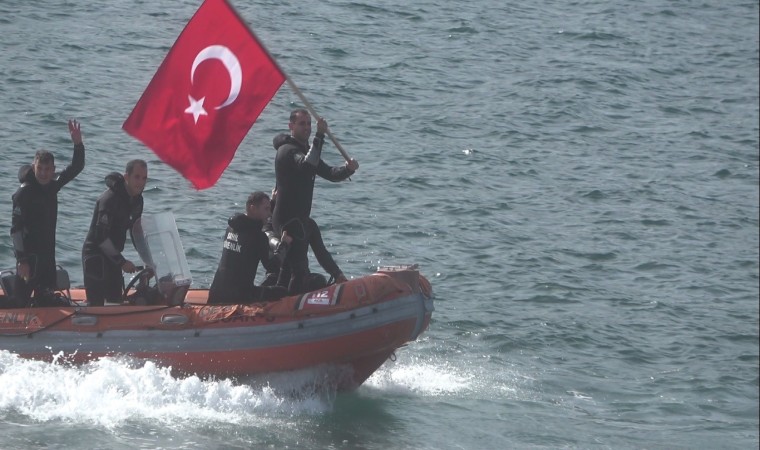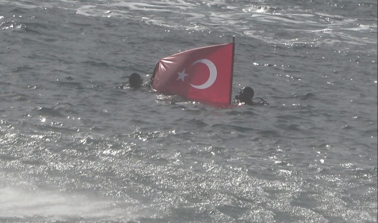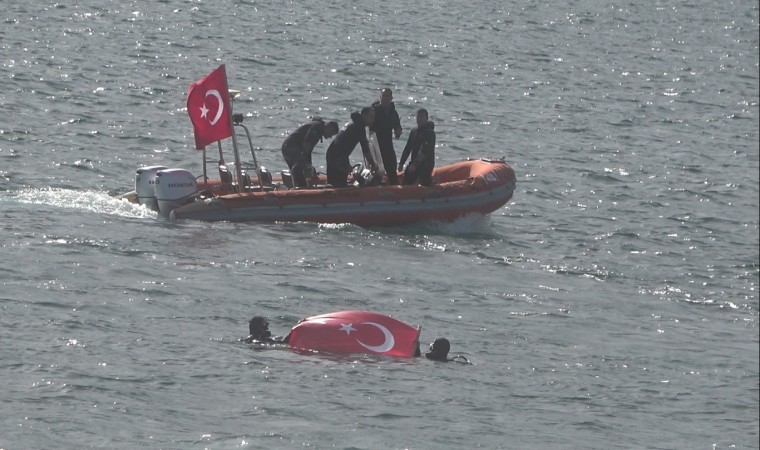 Gösterinin son bölümünde ise Türk Bayrağı’nın teslim töreni gerçekleştirildi. Denizde dalgıçların açtığı Türk Bayrağı, sahil güvenlik helikopterinden sarkıtılan halat yardımıyla sudan çıkarıldı. Bayrağı açan dalgıçlardan biri elindeki bayrakla birlikte sarkıtılan halat yardımıyla helikoptere çekildi. Dalgıç o anlarda gururla dalgalandırdığı Türk bayrağını, helikoptere ulaştıktan sonra katlayarak helikopterde görevli ekiplere teslim etti.