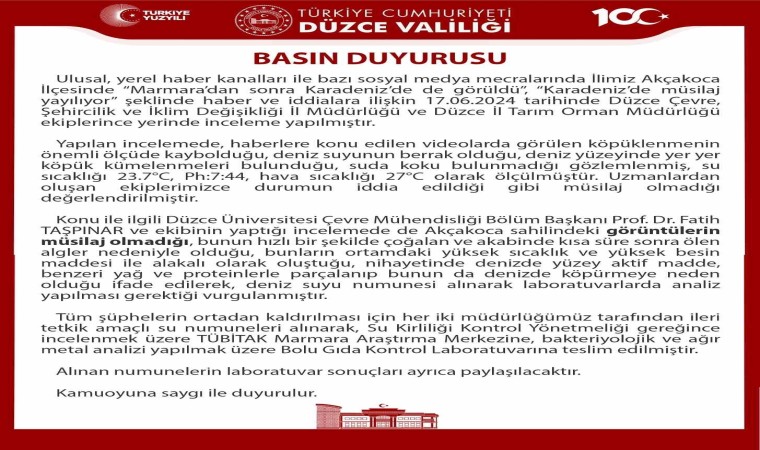 Düzce Valiliği Akçakoca ilçesinde denizde görülen beyazlığın müsilaj olmadığını açıkladı. Yapılan açıklamada "İlimiz Akçakoca ilçesinde ’Marmara’dan sonra Karadeniz’de de görüldü’, ’Karadeniz’de müsilaj yayılıyor’ şeklinde haber ve iddialara ilişkin 17 Haziran 2024 tarihinde Düzce Çevre, Şehircilik ve İklim Değişikliği İl Müdürlüğü ve Düzce İl Tarım Orman Müdürlüğü ekiplerince yerinde inceleme yapılmıştır. Yapılan incelemede, haberlere konu edilen videolarda görülen köpüklenmenin önemli ölçüde kaybolduğu, deniz suyunun berrak olduğu, deniz yüzeyinde yer yer köpük kümelenmeleri bulunduğu, suda koku bulunmadığı gözlemlenmiş, su sıcaklığı 23.7°C, Ph:7:44, hava sıcaklığı 27°C olarak ölçülmüştür. Uzmanlardan oluşan ekiplerimizce durumun iddia edildiği gibi müsilaj olmadığı değerlendirilmiştir. Konu ile ilgili Düzce Üniversitesi Çevre Mühendisliği Bölüm Başkanı Prof. Dr. Fatih Taşpınar ve ekibinin yaptığı incelemede de Akçakoca sahilindeki görüntülerin müsilaj olmadığı, bunun hızlı bir şekilde çoğalan ve akabinde kısa süre sonra ölen algler nedeniyle olduğu, bunların ortamdaki yüksek sıcaklık ve yüksek besin maddesi ile alakalı olarak oluştuğu, nihayetinde denizde yüzey aktif madde, benzeri yağ ve proteinlerle parçalanıp bunun da denizde köpürmeye neden olduğu ifade edilerek, deniz suyu numunesi alınarak laboratuvarlarda analiz yapılması gerektiği vurgulanmıştır. Tüm şüphelerin ortadan kaldırılması için her iki müdürlüğümüz tarafından ileri tetkik amaçlı su numuneleri alınarak, Su Kirliliği Kontrol Yönetmeliği gereğince incelenmek üzere TÜBİTAK Marmara Araştırma Merkezine, bakteriyolojik ve ağır metal analizi yapılmak üzere Bolu Gıda Kontrol Laboratuvarına teslim edilmiştir. Alınan numunelerin laboratuvar sonuçları ayrıca paylaşılacaktır” denildi.