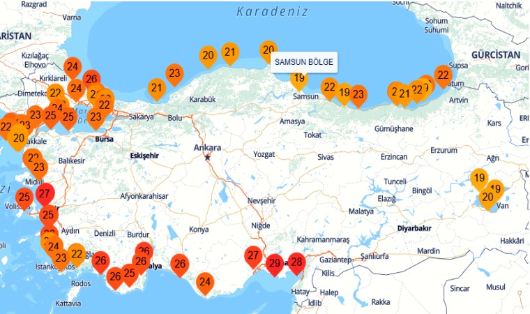 Ülke genelinde en yüksek deniz suyu sıcaklığı 29 derece ile Adana’da ölçülürken, İzmir, Antalya, Mersin, Muğla, İstanbul ve Balıkesir’de de deniz suyu sıcaklığı 25 derecenin üzerinde seyretti.