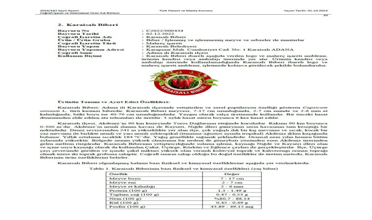 Adana’nın Karaisalı ilçesinde yetiştirilen ve bölgenin simgesi haline gelen Karaisalı Biberi, 1 Ekim günü 182 sayılı Resmi Coğrafi İşaret ve Geleneksel Ürün Adı Bülteninde ilan edilerek, Türk Patent ve Marka Kurumu tarafından coğrafi işaret alarak resmen tescillendi.