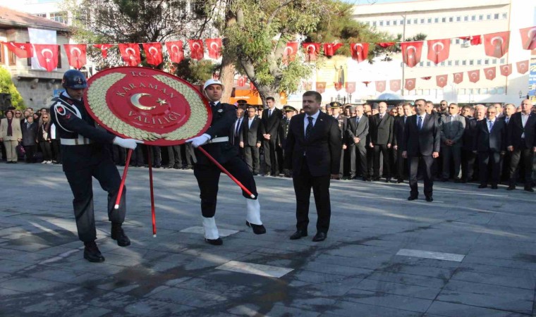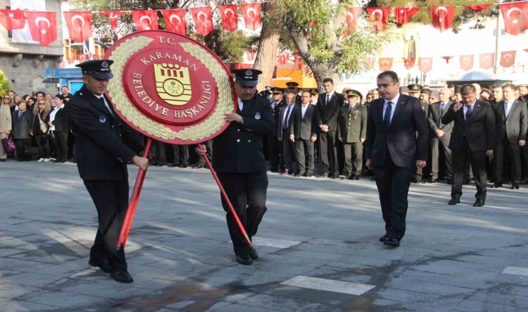 Cumhuriyet Parkı’ndaki Atatürk Anıtı önünde başlayan törene, Karaman Valisi Hüseyin Engin Sarıibrahim, Belediye Başkanı Savaş Kalaycı, Cumhuriyet Başsavcısı Ali İhsan Akdoğan, Karamanoğlu Mehmetbey Üniversitesi Rektörü Prof. Dr. Mehmet Gavgalı, İl Jandarma Komutanı Jandarma Kıdemli Albay Murat Alkan, İl Emniyet Müdürü Ahmet Selçuk Okumuş, siyasi parti temsilcileri, daire müdürleri, askeri ve sivil erkan katıldı. Atatürk Anıtı’na çelenk sunumunun ardından saat 09.05’te sirenler eşliğinde 2 dakikalık saygı duruşunda bulunuldu ve İstiklal Marşı okundu. Buradaki törenin ardından anma etkinlikleri Piri Reis Kültür Merkezi’ndeki programla devam etti.